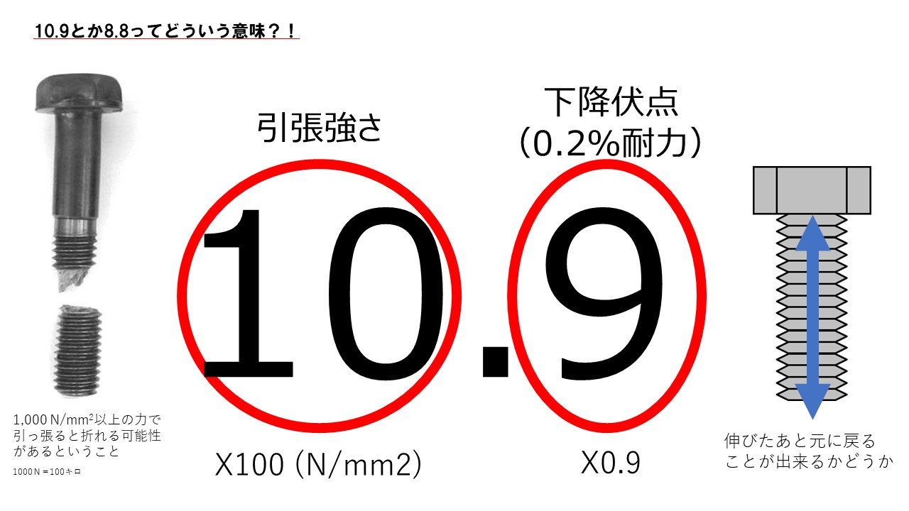 では右側の数字「9」はというと降伏点を表してまして1000N/mm2対して9割までの力で引っ張られてもねじは元に戻ろることが出来ます。ゴムと一緒で引っ張ったら戻ろうとする力と一緒です。