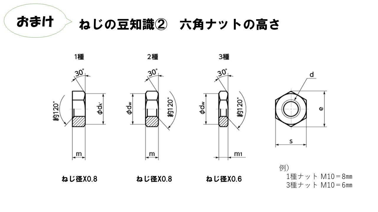 皆さんにもう一つだけ覚えていただきたいものがあります。それは六角ナットの高さです。六角ナットって1種2種3種であのーそれぞれあのねネジ径で高さを求めることができます。