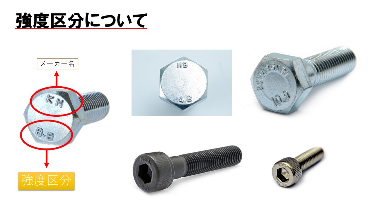 まずはねじの強度区分についてご説明させていただきたいと思います。皆さま見られたことあるかもしれませんが、六角ボルトには数字が入っていることが多いです。こちらは強度区分を表しています。