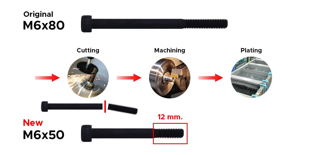 M6x50 の標準製品のねじ長さは 24mm ですが、上記のご要望の12mm のねじ長さの場合は規格外となります。このようなケースの場合、少量、特注品(規格外)のため企業様によってはこのリクエストを拒否する場合があります。
