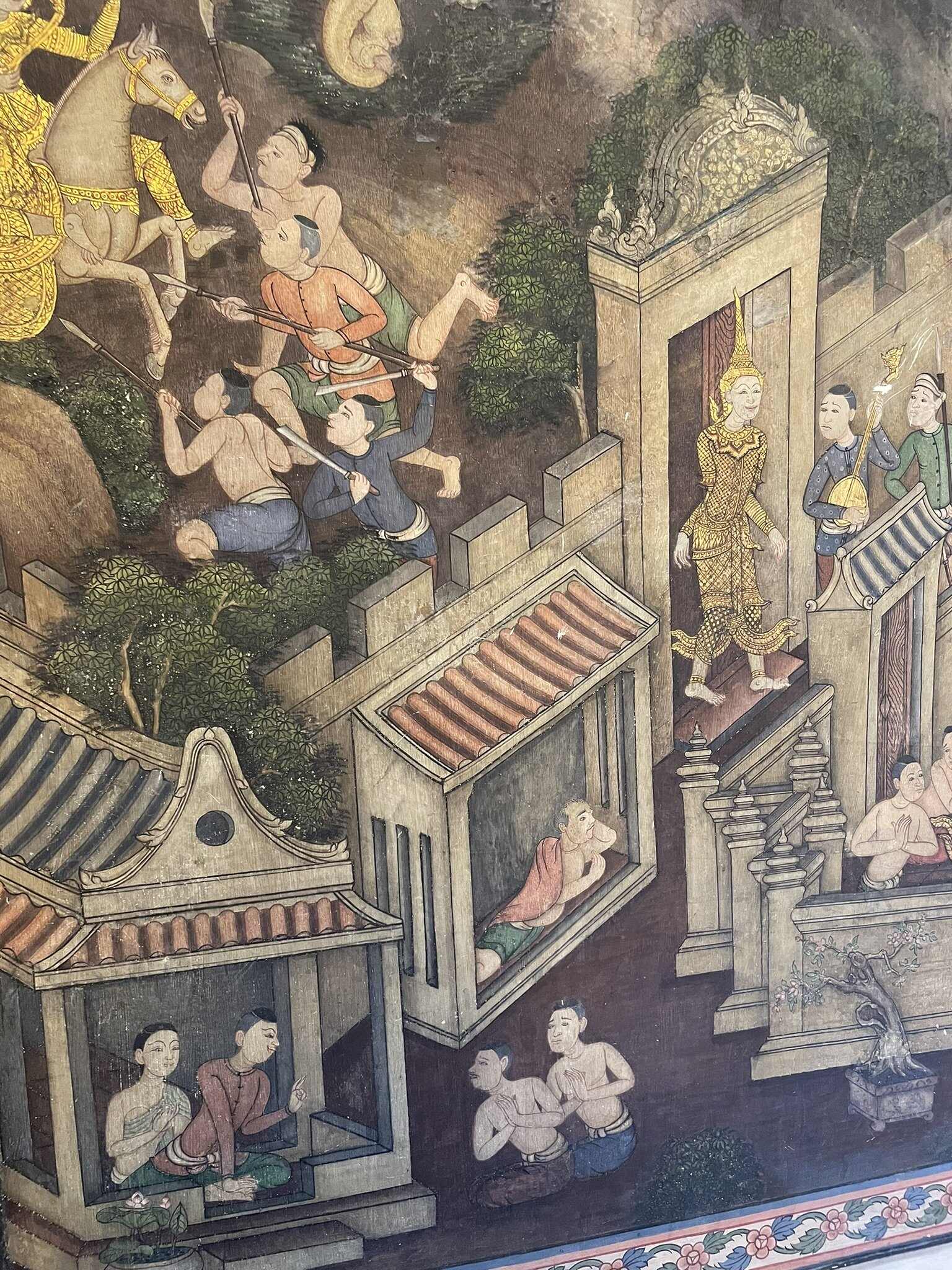 建物に入ると巨大な涅槃像と壁画が目に飛び込んできます。下の絵がその壁画なのですが、よく見てみると左手に戦っている人達がいるかと思えば壁一枚のところにのんびりと寝そべってる人がいます。またその横には神様らしき姿をした人もいれば楽器を持った人もいます。この壁画の状況がさっぱりわかりませんが、これを見た時「あ~、めっちゃタイやな」と感じました。