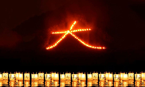 8 月 16 日の最終日には、祖先の霊を帰還の旅路に導くために再び火が灯されます。京都では、これは五山の送り火という行事によって特徴付けられます。この行事では、山腹に火が焚かれ、大や鳥居などの文字が形成され、霊を元の世界に導きます。この古くから神秘的な伝統は、その壮大な火で日本人だけでなく海外からの観光客も魅了します。