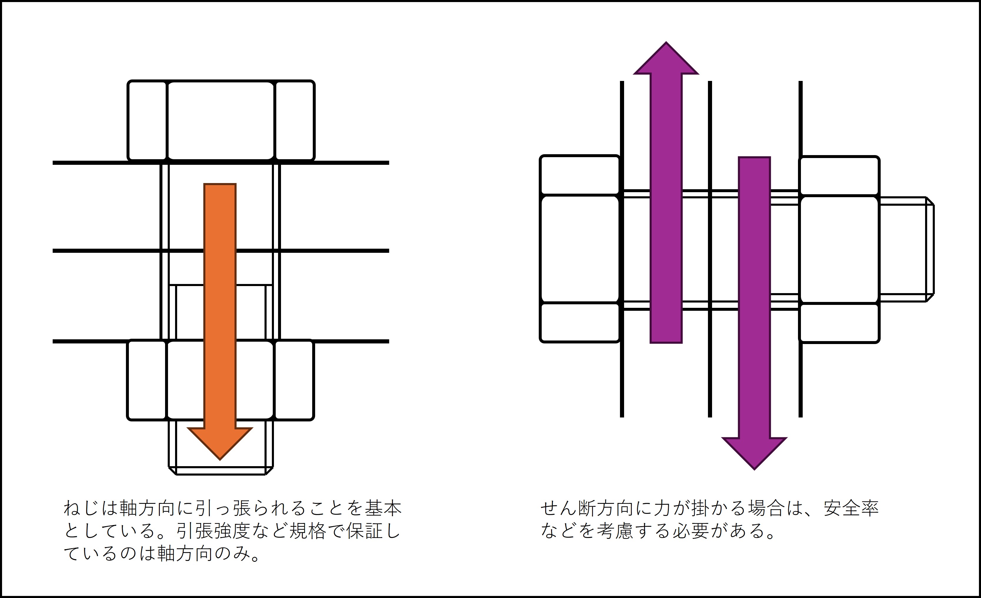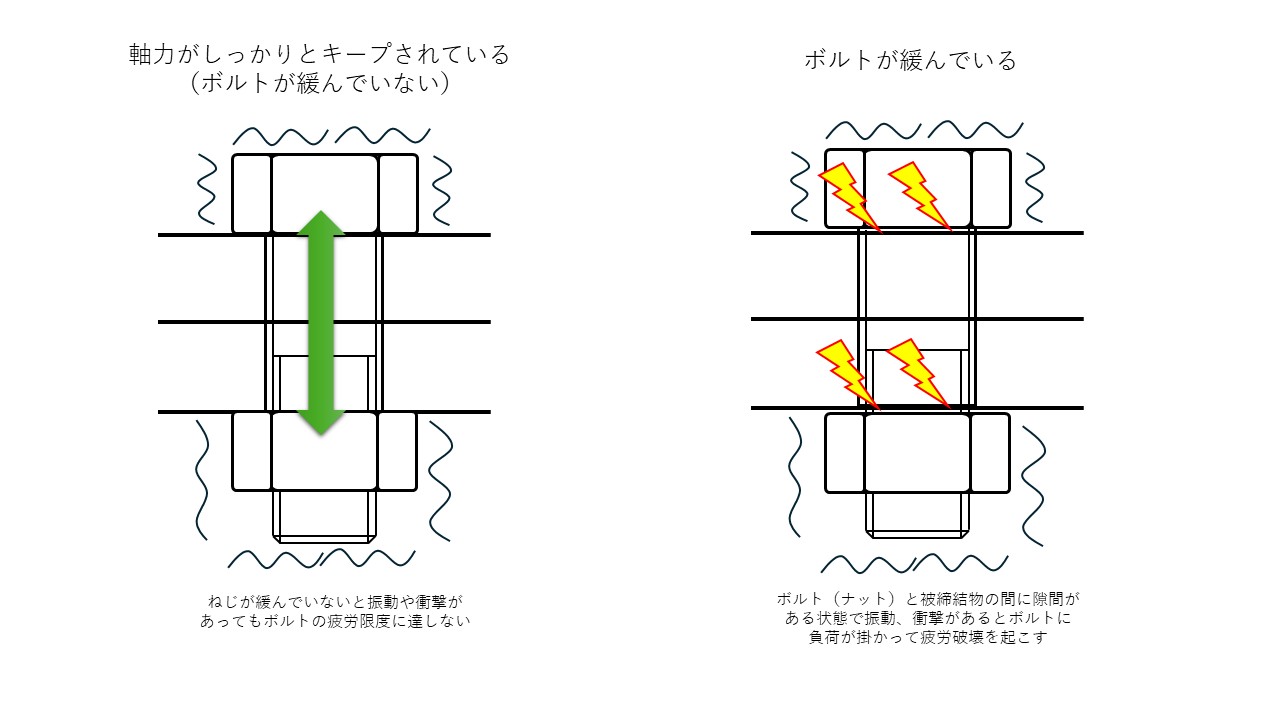 ボルトというものは、基本的に軸方向に引っ張られることを想定して作られていて規格で保証しているのは引張強度など軸方向の力となります。設計では出来るだけせん断方向に強い力が掛かるのを避けるようにするのが一般的ですが、どうしてもボルトのせん断方向に力が掛かるような使い方をしなければならないことがあることも事実です。その時にねじが耐えられる想定以上の力が掛かると折れてしまいます。