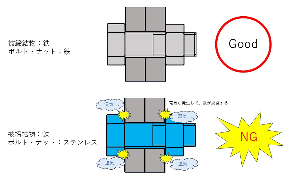 腐食の原因は上述したように異種金属のそれぞれが持つイオン化傾向の違いにあるので、同じ金属同士で使うとこの問題はなくなります。ですので、鉄のボルトには鉄のナット、ステンレスのボルトには、ステンレスのナットの組み合わせが基本になります。