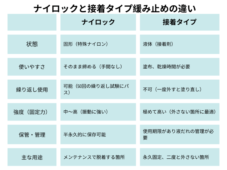 ナイロックと接着タイプの違いはナイロックが物理的な力で止めること。