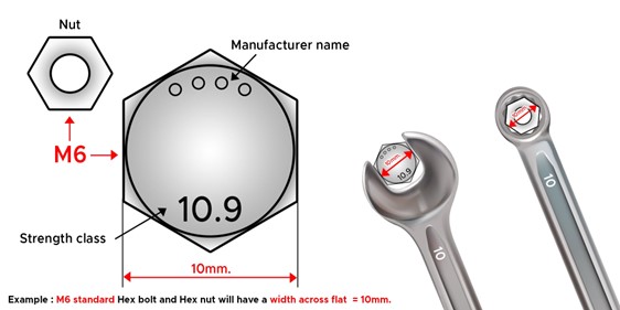 Number on the spanner indicate the size of the hexagon head bolt or nut at the head hexagon width flat side. For example, M6 standard Hex bolt and Hex Nut will have a width across flat = 10mm. Each size will be varied, so if you are not sure which size of spanner you should buy at the store, please check size chart of spanner with applicable fastener at the store or bring the actual fastener that you are going to use with to the store.