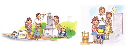 This day most of Japanese people will go back to their hometown and gathering with their families then spend time on doing activity together such as visiting their ancestor graves then, clean the area, putting flowers and other decoration, offer foods and Botamochi (A sweets made of rice cake with red beans paste) and pay respect to their beloved-ancestor and the Buddha. As a Buddhist, they belief that by doing this will help their ancestor souls to be able to cross the river and rest in peace.