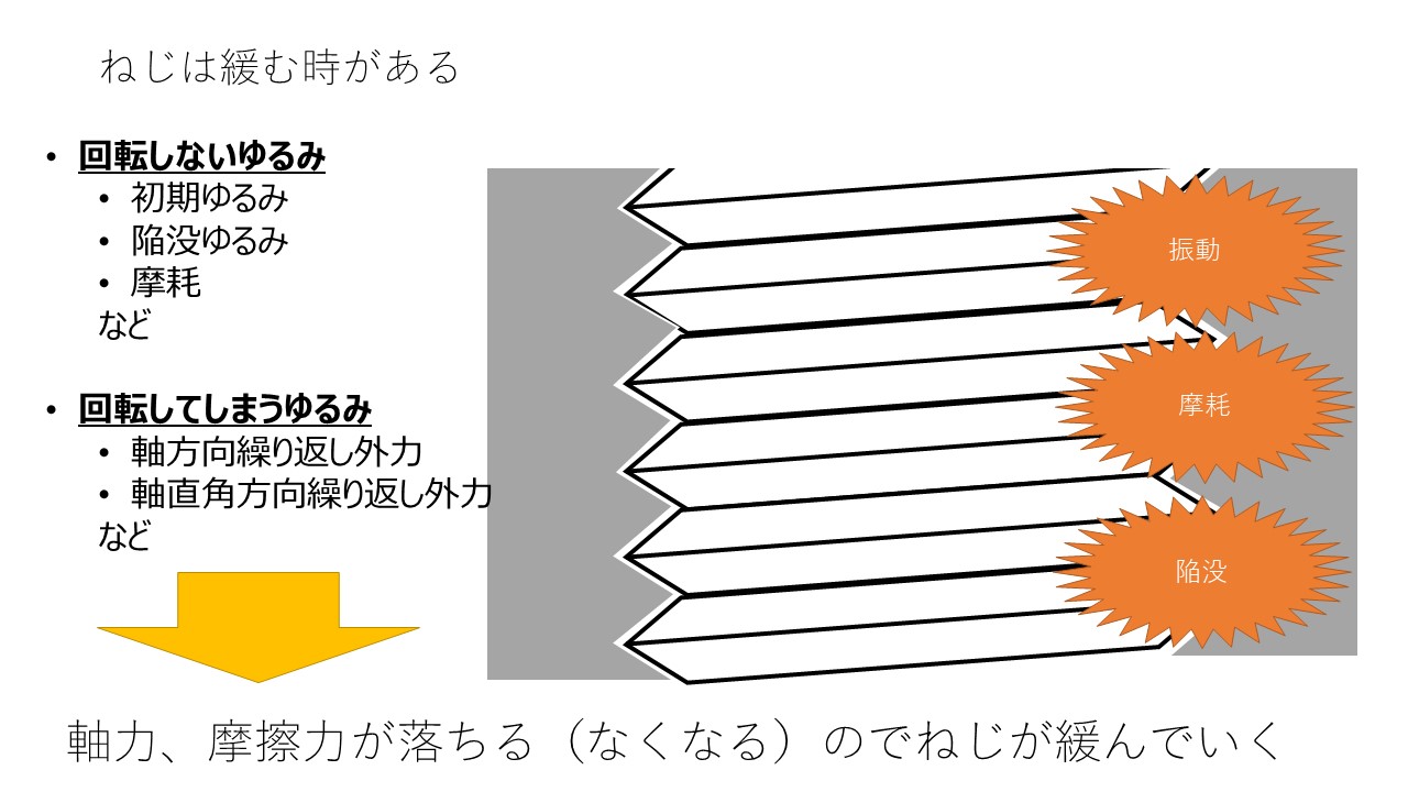 では逆になぜねじは緩んでしまう時があるのか?ということですが、それはその軸力と摩擦力が落ちる瞬間があるからなんです。雄ねじと雌ねじの間にはある程度の隙間が必ず存在します。隙間がないと嵌合(かんごう)できない、挿入できないからです。ただねじ締結後、振動や揺れ、衝撃があるとその隙間があるのでどうしても軸力が低下する瞬間が出てきます。そうすると軸力が低下、摩擦力が下がり緩んでしまうのです。もちろん他にも色んな緩みの原因はありますが、結局は軸力と摩擦力が低下した時にねじは緩んでしまうのです。